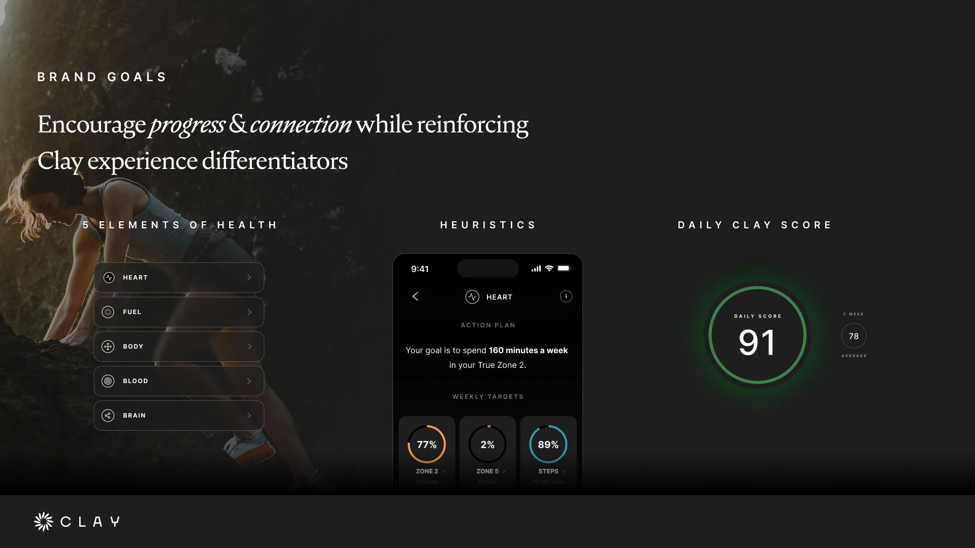 A core part of the product approach was designing Clay's foundational member education, anchored in the company's "5 Elements of Health" philosophy. I led the development of core narratives, language, and content frameworks to orient members to Clay's approach to health—translating clinical insight into accessible, trustworthy guidance delivered at the right moments in the member journey.